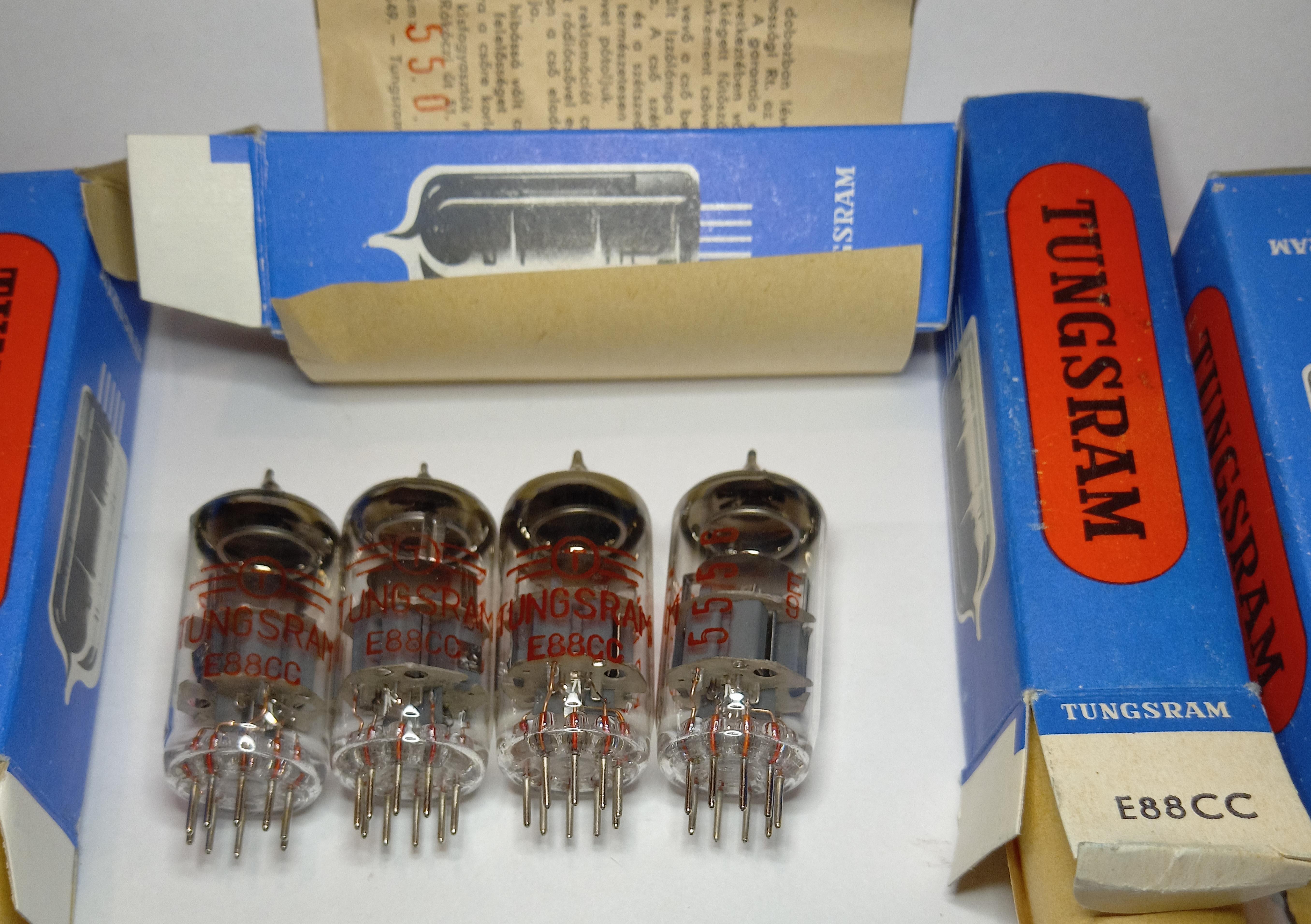 Радиолампы тунгсрам е88сс с редким красным принтом , с повышенной эмиссией катодов , триоды в баллоне близнецы , ноги никель не магнитные - 2 т.р.шт.